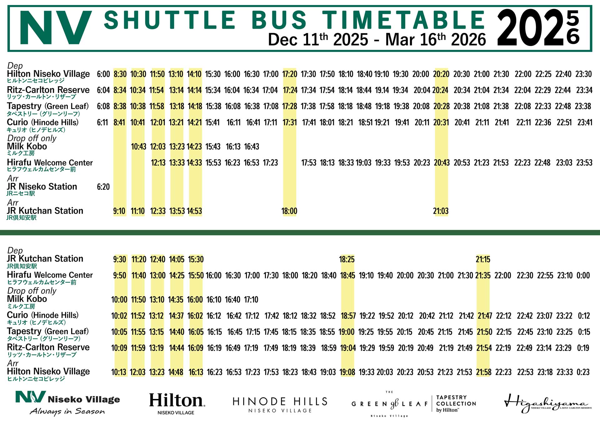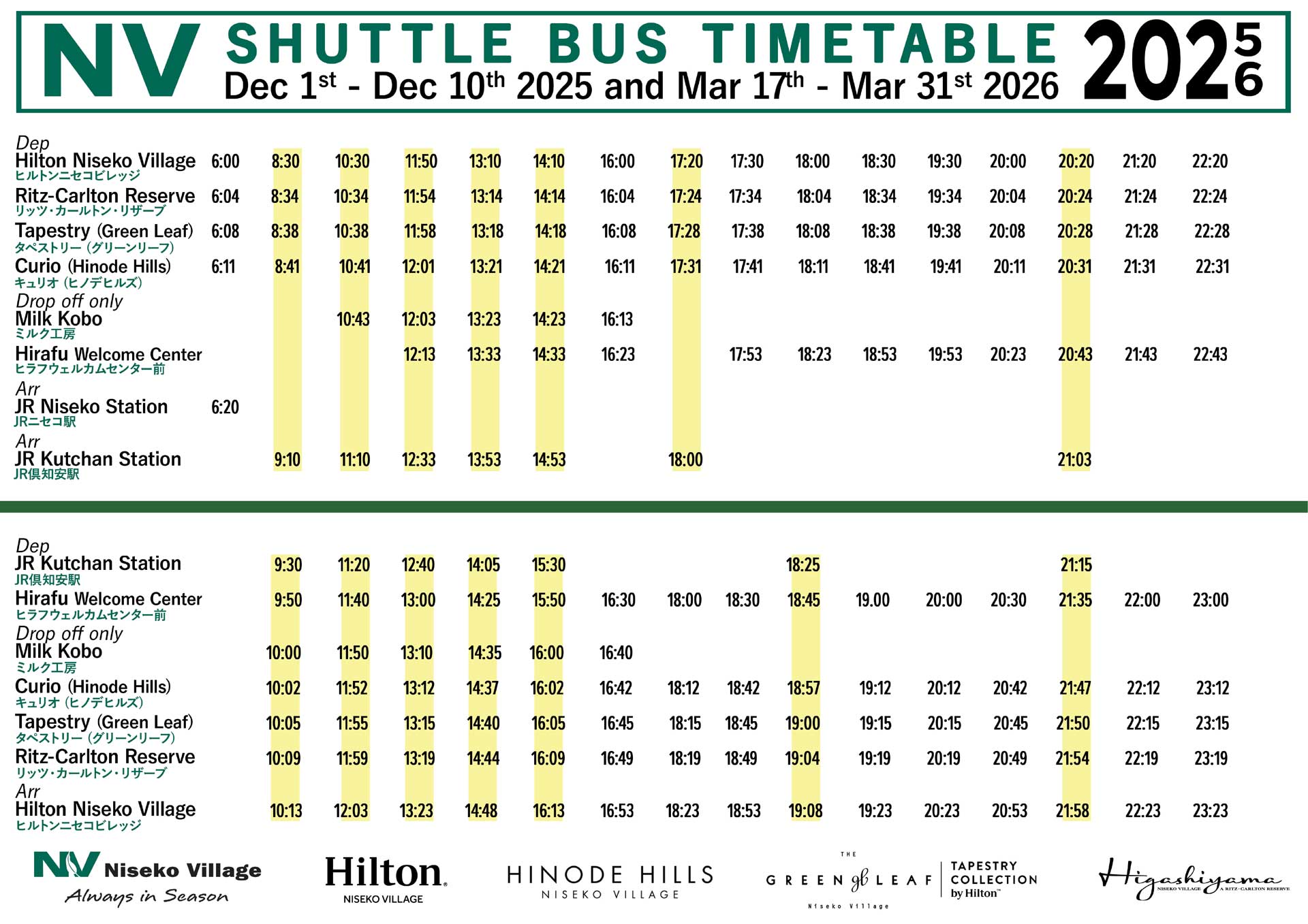 Niseko Village Bus Transportation New Chitose Airport ⇔ Hilton Niseko Village Hokkaido Resort Liner WEBSITE Niseko Direct Shuttle WEBSITE Local Guest Shuttle Bus