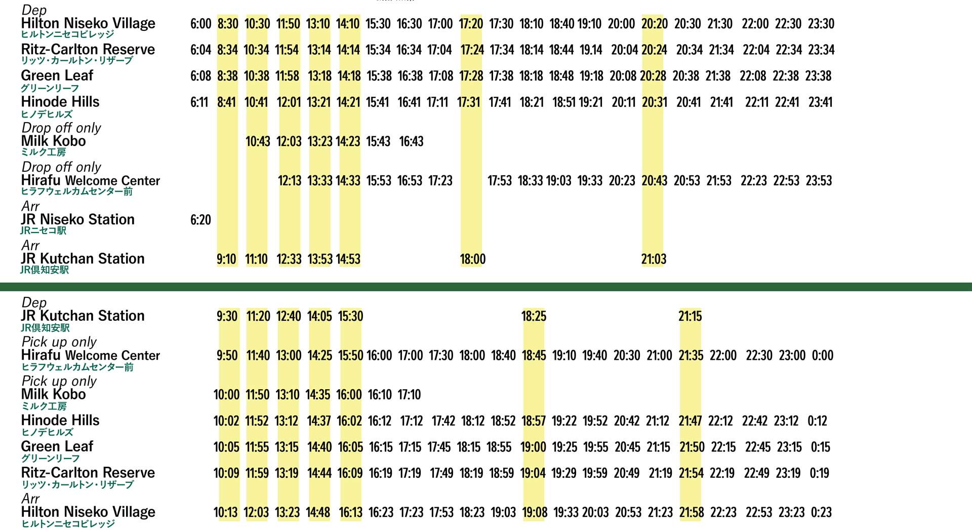 3月14日から31日までのJR列車の時刻変更に伴い、19:02 JR倶知安駅着の列車でヒルトン、ヒノデ、